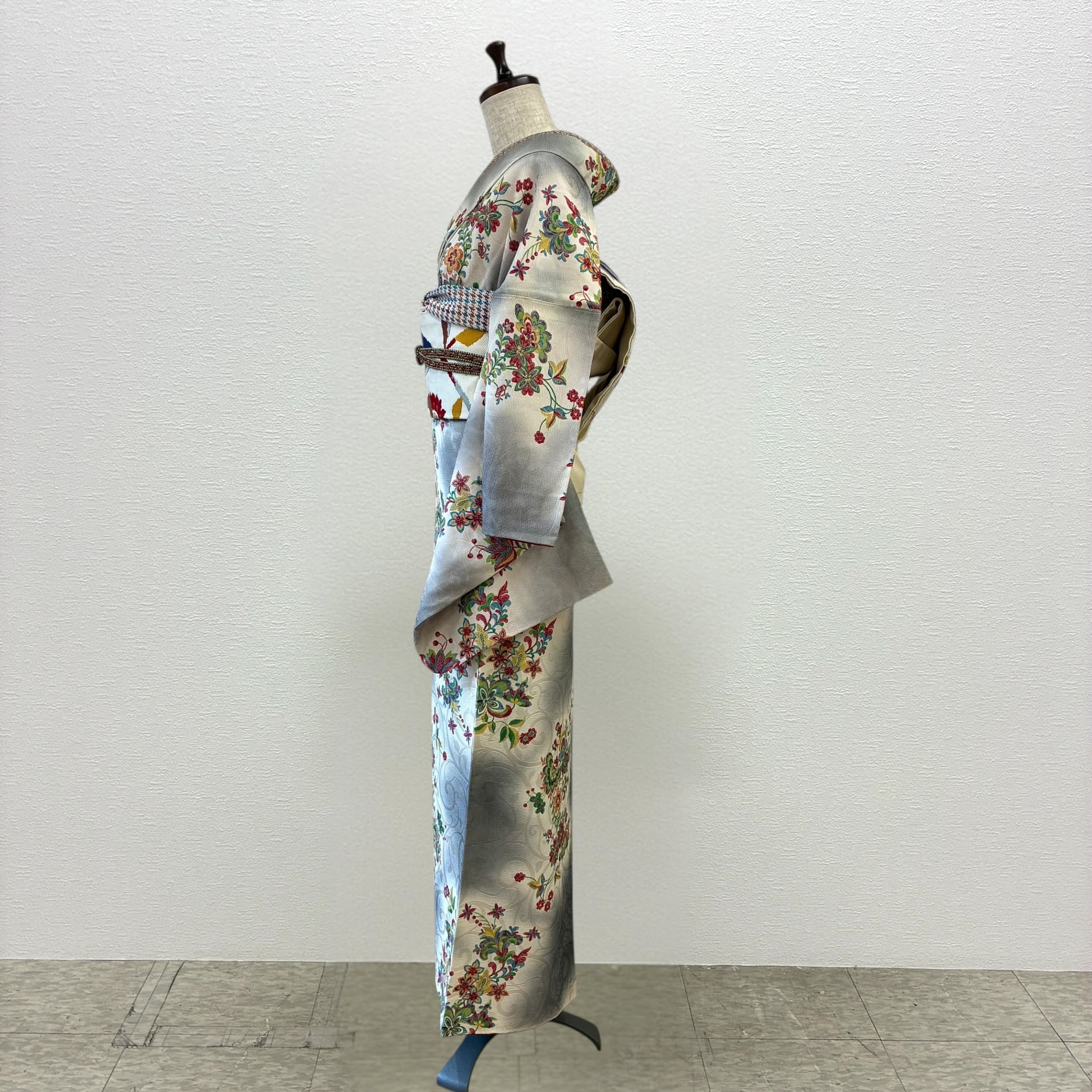 アンティーク 袷 リユース レトロ 花柄 グレー地