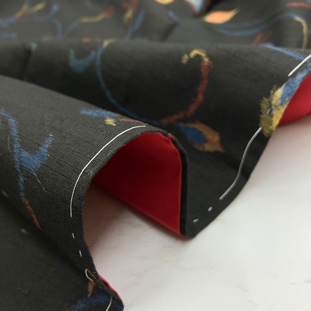 紬 袷 リユース 黒 鳥柄