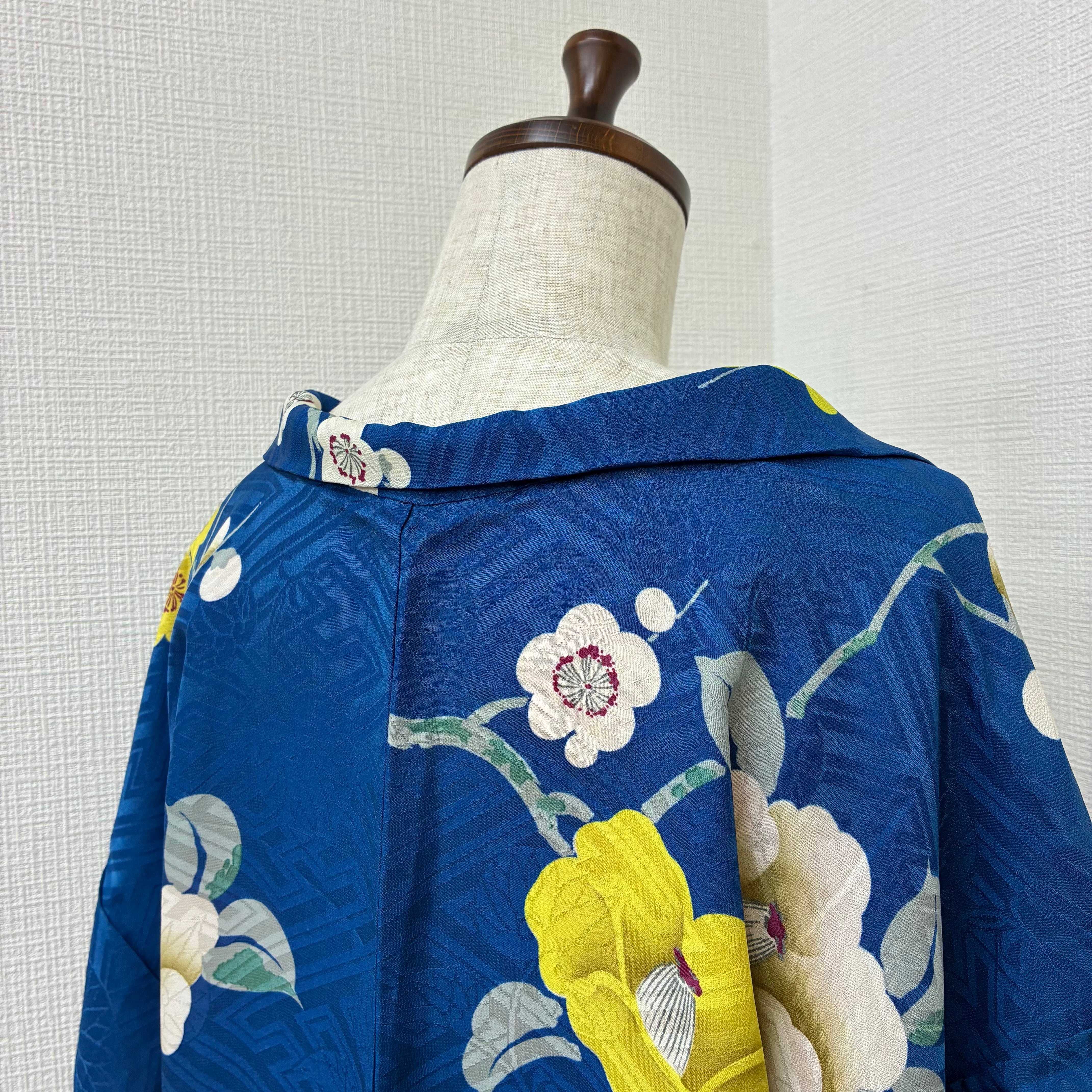 アンティーク羽織 リユース 青色地 羽織紐付 梅椿